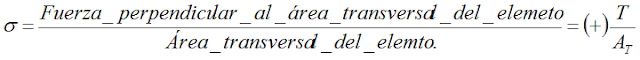 - Esfuerzo de Tensión: es aquel que tiende a estirar el miembro y romper el material. Donde las fuerzas que actúan sobre el mismo tienen la misma dirección, magnitud y sentidos opuestos hacia fuera del material. Como se muestra en la siguiente figura. Y viene dado por la siguiente formula: